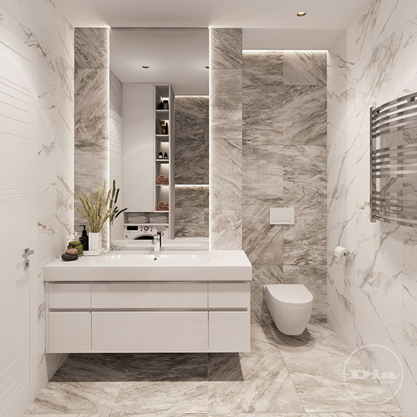 Монохромный интерьер трехкомнатной квартиры отличается от динамичной ванной комнаты. Пространство санузла получилось таким броским и одновременно лаконичным благодаря разнообразному рисунку керамогранита под мрамор.