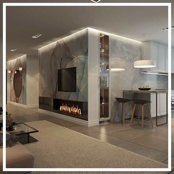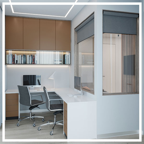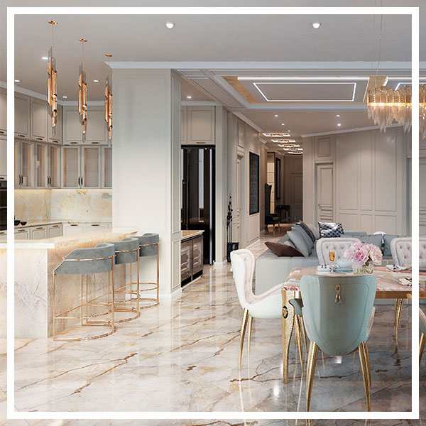 За основу интерьера трехкомнатной квартиры и, в частности, кухни-гостиной были выбраны сдержанные пастельные тона. Интерьер квартиры получил функциональное зонирование. В одной части квартиры сформировалось общесемейное пространство с совмещенной кухней-гостиной и обеденным столом у окна. Во второй — две спальни с приватным санузлом и гардеробной.