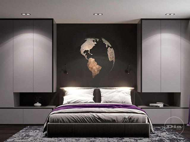 Акцентом в интерьере спальни стал фиолетовый текстиль. Во-первых, этот оттенок отлично сочетается с монохромными стенами и фасадами. Во-вторых, в Минске мало солнца, а яркий цвет помогает восполнить нехватку красок в интерьере четырехкомнатной квартиры и за окном.