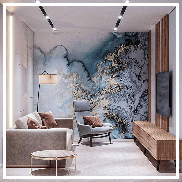 Благодаря нестандартной планировке квартиры дизайнеры Студии DIA получили возможность органично распределить площадь между жилыми и хозяйственными помещениями. Например, три спальни находятся в разных частях квартиры, а одна из них со своей гардеробной, лоджией и ванной комнатой. Для кухонной зоны были подобраны лаконичные цвета и фактуры, благодаря чему эта часть интерьера остается фоновой. Акцентом кухни-гостиной стала гостиная зона с имитацией рисунка камня: ее благородные сине-голубые оттенки с вкраплением золота оживляют весь интерьер.